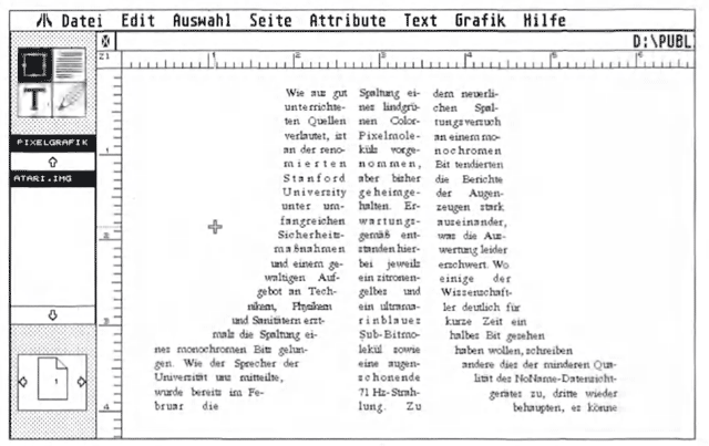 Das nächste Textformat war ASCII, also keinerlei Attribute im Text. Im großen und ganzen hat der Import keine Schwierigkeiten gemacht, nur bei der weiteren Bearbeitung eines Textes - unabhängig vom ursprünglichen Format - mußten wir leider einige Enttäuschungen erleben. Da sollte beispielsweise ein Absatz im Blocksatz formatiert werden. Dabei kam es zu etwas unrühmlichen Effekten, wie z.B. 15 kleinen und einem riesengroßen Wortabstand innerhalb einer Zeile. Auch nach 10 Minuten äußerster Anstrengung war der Publisher nicht zu bewegen, diesen Umstand zu ändern. Wie sich bald herausstellte, war es typographisch-publizistische Einfalt. Die Texte, die als Beispiele für den ASCII-Import dienten, waren nämlich nicht für diesen Zweck gedacht und hatten am Zeilenanfang Tabulatoren bzw. entsprechend viele Leerzeichen. Es ist, wie mittlerweile bekannt, für nahezu jedes DTP-Programm tödlich, derart mißhandelte Text zu verarbeiten, bzw. es läuft darauf hinaus, daß der gesamte Text von Hand nachbearbeitet werden muß. Der Timeworks Publisher stellt hier also durchaus keine Ausnahme dar. Ergänzende Versuche mit korrekt - ohne Tabs und Trennungen - geschriebenen ASCII-Texten verliefen dann auch mehr als zufriedenstellend. Einen 3spaltigen Satz zu erstellen und auszudrucken, ist zum einen kinderleicht und zum anderen extrem schnell zu bewerkstelligen.