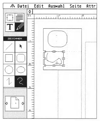 Grundsätzlich sei zu den Textfunktionen gesagt, daß sie sehr übersichtlich sind, wenn man das Prinzip der Bedienung durchschaut hat. Der Durchblick kommt auch sehr schnell. Aber wie üblich in der ATARI-Szene, macht jeder Software-Hersteller ohnehin seine Menüs, wie er will. Da sollte man sich doch von denen mit der angekauten Frucht etwas abschauen. Verlassen wir nun die Textlünktionen und wenden uns den Grafikobjekten zu.