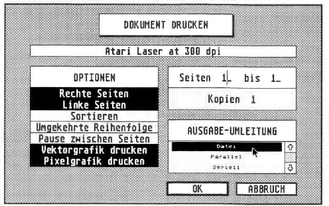 Ein Manko gibt es jedoch. Es soll Anwender geben, die einen Laser- und einen Nadeldrucker angeschlossen haben. Im Timeworks Publisher fehlt jegliche Möglichkeit, eine andere Druckeranpassung zu laden. Einmal installiert, ist der Drucker fest eingestellt. Das liegt möglicherweise an dem Datenformat der Schriften, welche bei der Programminstallation speziell für den gewünschten Drucker generiert werden. Möchte man also einen zweiten Drucker betreiben, muß man den Timeworks Publisher mit dem beiliegenden Installationsprogramm mit mehreren verschiedenen Druckern installieren. Zum Wechseln der Druckeranpassung muß man aber immer den Publisher verlassen, das Installationsprogramm starten, den Drucker auswählen, den man möchte, und wieder rein in den Publisher. Ob das unbedingt der Weisheit letzter Schluß ist, möchten wir hiermit bezweifeln!