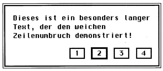 Der zweite Parameter ist ein Zeiger auf den Text, der in der Alertbox darzustellen ist. Er kann quasi beliebig lang sein, die Maximalzahl der Zeilen darf allerdings nicht überschritten werden. Im Gegensatz zu form_alert() dürfen die harten Trennungen mit dem senkrechten Strich entfallen. Do_alert() formatiert den Text dann selbst. Wird jedoch ein senkrechter Strich gesetzt, nutzt do_alert() diesen als harten Umbruch.