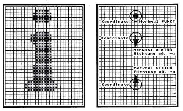 Typisches Beispiel hierzu: Das kleine ‘i’ (siehe auch Bild 2). Es hat mindestens drei markante Punkte, von denen der i-Punkt (im wahrsten Sinne des Wortes) der markanteste ist. Vom i-Punkt aus gesehen haben alle acht direkten Nachbarpunkte eine gegensätzliche Farbe, also hat dieser markante Punkt das höchstmögliche Maß an Ausprägung. Die Wahl der markanten Punkte unterliegt wichtigen Gesetzmäßigkeiten. So nimmt die Treffergenauigkeit ab, wenn zu wenige markante Punkte definiert wurden, kurioserweise ist das auch der Fall, wenn es zuviele sind. Auch sind die Lage, Entfernung und das Verhältnis der markanten Punkte zueinander zu beachten. Typische Punkte hoher Ausprägung sind End- und Eckpunkte. Punkte innerhalb von Linien eignen sich nicht als markante Punkte.
