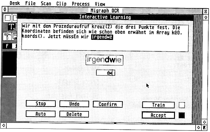 Der Erkennungsprozeß gestaltet sieh in MIGRAPH OCR anders, als man von den bekannten Programmen her gewöhnt war. Unmittelbar nach dem Start des Erkennungslaufes wollen die Vergleicher (so nenne ich Programme nach dem Pattern-Matching-Prinzip) sofort einige Buchstaben bestätigt haben, was sich im Laufe des Prozesses in immer selteneren Rückfragen äußert Irgendwann wird man nur noch bei ganz kritischen Zweifelsfällen gefragt - das System hat sich eine größer werdende Zeichenbibliothek angesammelt (die unbedingt für ähnliche Arbeiten abgespeichert werden soll).