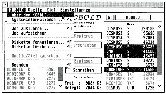 Bereits rein optisch zeigt sich Kobold 2 nach dem Programmstart in neuem Gewand. Altvertraut sind die Bereiche, in denen die Dateien des Quell- bzw. Zielmediums angezeigt werden. Wie bisher ist es möglich, zunächst Dateien von verschiedenen Quellen einzulesen, bevor sie dann auf das Ziellaufwerk geschrieben werden. Auch eine Reihe von dateiorientierten Funktionen wie das Löschen einzelner Dateien oder ganzer Laufwerke sowie das Verschieben von Daten werden von Kobold in hoher Geschwindigkeit ausgeführt. Bereits eingelesene Dateien lassen sich vor dem Zurückschreiben in dem Sinne umorganisieren, daß sie in einen anderen Ordner verlegt werden. Da solche Aktionen lediglich im Speicher des Rechners ablaufen, also keine Plattenzugriffe notwendig sind, ist ein Arbeiten ohne Wartezeiten garantiert. Viele Programmfunktionen von Kobold werden nicht mehr wie bisher über Knöpfe, sondern über die Menüleiste erreicht, die sich als Teil des Kobold-Fensters präsentiert. Durch Shortcuts und über die Funktionstasten ist das Programm weiterhin vollständig per Tastatur bedienbar. Dialoge lassen sich auf Wunsch in Fenstern unterbringen, so daß in einem Mehrprozeßsystem der Wechsel zu einer parallel laufenden Anwendung erlaubt ist. Da ein Programmwechsel auch während eines Kopiervorgangs möglich ist, bietet es sich an, umfangreiche Aktionen im Hintergrund ablaufen zu lassen. Hiervon profitiert man übrigens nicht nur in einer echten Multitasking-Umgebung, sondern auch im normalen Betrieb. Kobold läßt sich nämlich auch als Accessory einsetzen und ist so jederzeit präsent. Datenverluste bei der Arbeit von Kobold im Hintergrund sind nicht zu befürchten, da Kobold in der Lage ist, Quell- und Ziellaufwerk während des Kopiervorgangs für Zugriffe anderer, parallel laufender Anwendungen zu sperren.