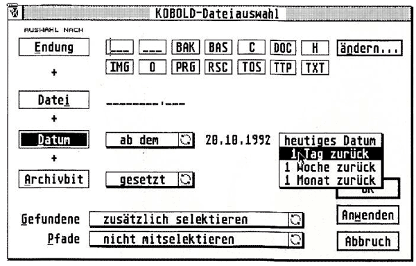 Zu Backups mit Kobold ist grundsätzlich zu sagen, daß diese ausschließlich dateiorientiert angelegt werden können. Es ist also nicht möglich, eine komplette Festplattenpartition an einem Stück auf mehreren Disketten unterzubringen. Ein Aufteilen der zu sichernden Daten in kleinere Einheiten, die dann jeweils auf getrennten Disketten untergebracht werden, ist unerläßlich. Diese Einschränkung hat den Nachteil, daß Komplett-Backups auf Disketten nur durch die Erstellung eines ausgefeilten Jobs angelegt werden können. Der Vorteil der mit Kobold erstellten Back-ups liegt darin, daß alle Daten unkomprimiert auf vom Desktop lesbaren Disketten vorliegen. Einzelne Dateien lassen sich also unkompliziert wieder restaurieren. Besonders interessant sind die von Kobold gebotenen Backup-Möglichkeiten für Besitzer einer Wechselplatte. Hier ist die Problematik der Verteilung von Dateien auf mehrere Medien nebensächlich. Durch eine Vielzahl von Kriterien bei der Auswahl der Quelldateien (Bild 3) lassen sich leicht sogenannte inkrementelle Backups auch größeren Umfangs realisieren. Dabei werden nur diejenigen Daten gesichert, die sich seit dem letzten Backup geändert haben bzw. neu hinzugekommen sind. Hat man sich einmal eine Job-Datei für eine solche Operation erstellt (oder von Kobold aufzeichnen lassen), stellen inkrementelle Backups ein Kinderspiel dar.