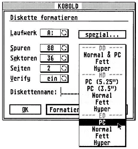 Mit Kobold 2 lassen sich nicht nur Dateien schnell und komfortabel kopieren. Das Programm bietet ferner eine ganze Reihe weiterer nützlicher Funktionen. Besonders hervorgehoben sei die Möglichkeit, nicht nur DD- und HD-Disketten, sondern auch ED-Disketten formatieren und bearbeiten zu können (Bild 3). Allen, denen der Begriff ED noch nicht geläufig ist, sei gesagt, daß es sich hierbei um eine Abkürzung für Extended High Density handelt. Dieses Diskettenformat, das bereits auf dem NeXT und neuen IBM-PCs zur Verfügung steht, erlaubt es, mit speziellen ED-Laufwerken 2.88 MB an Daten auf ED Disketten zu speichern. Auch für alle Atari-Computer sind inzwischen ED-Aufrüstsätze von Fremdanbietern erhältlich. Wie so häufig, läßt sich die vorgesehene Diskettenkapazität auch hier noch steigern, so daß auf ED-Disketten mehr als 3 MB an Daten untergebracht werden können.