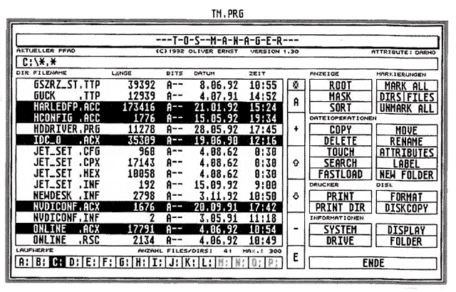 TOS-MANAGER ist ein Mehrzweck-Utility für die ATARI ST-Serie, das neben den üblichen Operationen wie Kopieren, Löschen usw. Directories und Files ausdrucken und verschiedene System- und Datei-Informationen anzeigen kann. Dabei wird jeweils das aktuelle Directory angezeigt. Dort können beliebige Dateien und Directories markiert und bearbeitet werden. Die Markierungen bleiben beim Scrollen erhalten. TOS MANAGER wird praktisch nur mit der Maus bedient. Es wurde als Accessory entwickelt, so daß alle diese Funktionen aus jedem GEM-Programm aufrufbar sind. Damit kann man z.B. im „Notfall“ noch schnell dringend benötigten Platz für das Sichern einer mühevoll erstellten Datei schaffen oder noch rechtzeitig die unbedingt benötigten Dateien ins richtige Directory kopieren. TOS MANAGER kann jedoch durch Umbenennen auch als Programm gestartet werden.