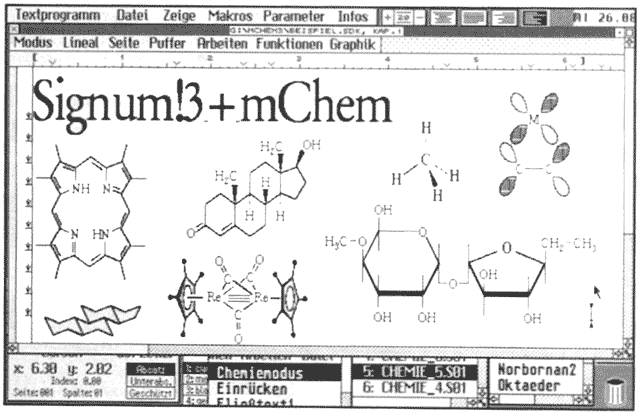 Mit mChem lassen sich chemische Formeln direkt im (Signum!3-) Text erstellen und bearbeiten. Im Lieferumfang befinden sich 4 Chemiezeichensätze, 4 Makrodateien, eine Formelbibliothek und ein ausführliches Handbuch. Aus den Zeichensätzen werden durch die mitgelieferten Makros sinnvolle Bausteine zusammengesetzt, aus welchen sich wiederum schnell verschiedenartige Moleküldarstellungen in hoher Qualität aufbauen lassen. Die einmal erstellten Formeln können in Bausteinlisten abgespeichert werden, so daß der Aufbau individueller Formelbibliotheken möglich ist. Das Spektrum der Möglichkeiten reicht von der einfachen Schulbuchchemie bis zu komplexen Darstellungen aus der Metallorganik und der Naturstoffchemie. Preise: 199 DM (149 DM für Studenten/Schüler), 699 DMKomplettsystem (Signum!3+mChem3) (DM 599 für Studenten/Schüler) zzgl. 5 DM Versandkosten.