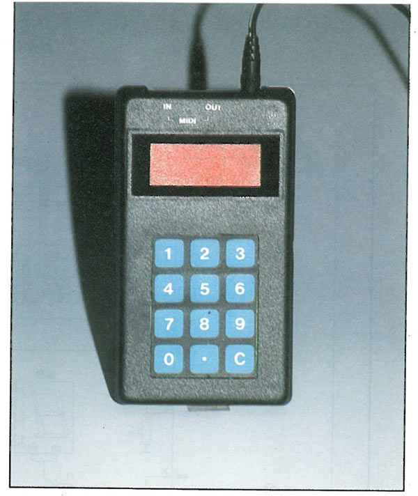 Der „MIDI-PROGRAM-CHANGER“ besitzt eine MIDI-IN- und -OUT-Schnittstelle und kann dadurch problemlos in ein vorhandenes MIDI Netz eingebunden werden, z.B. zwischen der MIDI-Out-Schnittstelle eines Keyboards und der MIDI-IN-Schnittstelle eines Expanders. Die Tasten „0 - 9“ dienen der Eingabe einer maximal 3stelligen dezimalen Preset-Nummer. Mit der Taste „C“ (Clear) kann eine falsch eingegebene Preset-Num-mer gelöscht und wieder neu eingegeben werden. Die Taste (Enter) dient der Eingabebestätigung und dem Senden der Preset-Nummer an ein angeschlossenes MIDI-Gerät, dabei blinkt die Anzeige kurz auf. Zusätzlich gibt es noch die Möglichkeit, zwei Tasten mit der Bezeichnung „Program-UP“ und „Program-DOWN“ an den Tastenport des 8031 anzuschließen. Sie ermöglichen das schnelle Suchen nach einer bestimmten Preset-Nummer, ohne jedesmal eine neue Preset-Nummer über die Tastatur eingeben zu müssen. Anzumerken sei noch, daß die Preset-Nummern nicht bei „0“ beginnen, sondern von „1-128“ Das gleiche gilt für den MIDI-Kanal, 1-16 statt 0- 15. Bei falschen Eingaben, z.B. „000“ oder „999“ wird eine Error-Meldung angezeigt. Die Anzeige erlischt bei Eingabe einer neuen Preset-Nummer, oder bei Betätigung der „Clear“-Taste. Sollte versehentlich einmal die „Clear“-Taste gedrückt werden, genügt ein Druck auf die „Enter“-Taste, um die alte Programm-Nummer wieder anzuzeigen. Mit dem DIP-Schalter läßt sich der MIDI-Kanal für die Preset-Nummer einstellen.