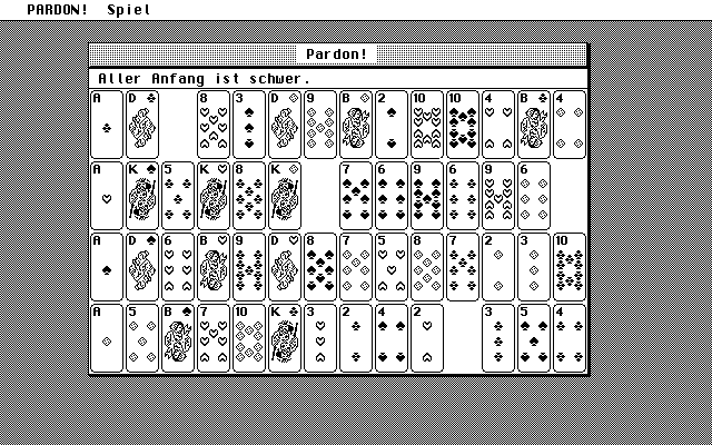 Bei Pardon! handelt es sich um die Computerumsetzung einer Patience. Ziel einer Patience ist es, eine gewisse Anzahl von Karten nach bestimmten Regeln in eine vorgeschriebene Reihenfolge, meist auf- und absteigende Reihen, zu bringen. Hierbei wird meist allein gespielt, was aber dennoch nicht daran hindert, zu zweit oder mehreren zu versuchen, das Spiel zu lösen.