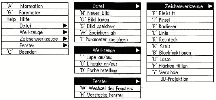Die Anzahl der Werkzeuge ist bei Piccolo auf das Notwendigste beschränkt. Das verwöhnte Auge vermißt z.B. eine Sprühdose, Kreisbögen oder eine Textfunktion. Anscheinend wurde bei Piccolo primär auf eine einfache, intuitive Benutzerführung Wert gelegt. Die meisten Werkzeuge öffnen ein sogenanntes Panel zur Einstellung der Werkzeug-Parameter. Das besondere hierbei: sie behindern die Arbeit nicht, auch wenn sie mitten auf der Zeichenfläche erscheinen; denn sämtliche Werkzeuge bleiben auch hinter den Panels aktiv! Zur Orientierung auf der Arbeitsfläche bietet Piccolo die Möglichkeit, ein Lineal einzublenden, an dem die jeweilige Position in Bildschirm-Pixeln angezeigt wird. Fehler lassen sich schnell durch die UNDO-Funktion ausbügeln; an ein REDO wurde leider nicht gedacht.