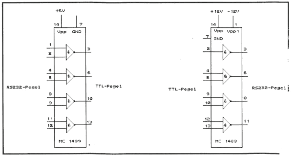 Für eine solche Wandlung gibt es zwei spezielle Bausteine, und zwar den MC 1488 für TTL nach RS232 und den MC 1489 für RS232 nach TTL. Die Beschaltung dieser beiden Chips können Sie aus der Abbildung entnehmen.