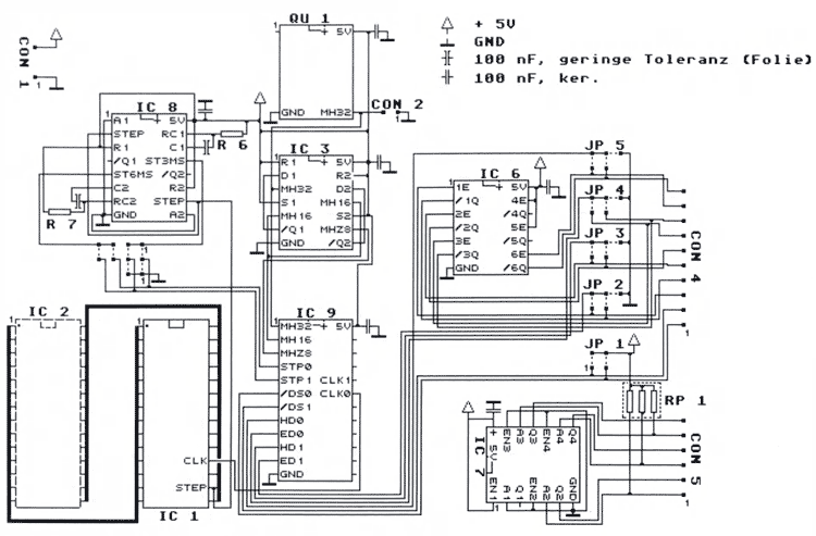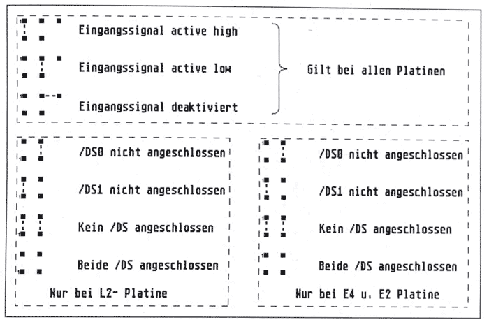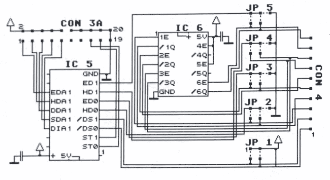 Doch nun zum wichtigsten, den Eingangssignalen. Diese Eingangssignale, also die /Drive Select-(/DS), ED-und HD-Signale, werden bei allen Modulen an „CON 4“ angeschlossen, wie in Abb. 9 zu sehen. Die /DS-Signale sind alle numeriert. Diese Nummern sind nur als Anschlußhilfen gedacht, also gehören z. B. /DS0, STP0 (s. oben und Abb. 12), HD0 und ED0 zusammen und müssen nicht zwangsweise vom Laufwerk kommen, das das /DS auf 0 gejumpert hat, sondern nur von ein und demselbem Laufwerk (bis auf STPx, das ja auf dem Modul erzeugt wird). Die HD-und ED-Signale werden durch einen 74LS04 invertiert, wenn man z. B. die in [3] beschriebene HD-Erkennung für 5 1/4“-Disketten benutzen möchte. Deshalb liegen diese invertierten Eingangsignale auch an „CON 4“ wieder an. Sie werden auch dann im Modul intern verwendet, wenn man, aus welchem Grund auch immer, die HD-oder ED-Signale active low definiert hat, damit durch entsprechendes Jumpern von „JP 2-5“ (Abb. 13) das Modul funktioniert. Die entsprechenden Signale werden dann über die Jumper den GALs zugeführt. Die an den GALs (egal welchen) anliegenden HD-und ED-Sinale sind immer active high (s. Listings für GAL 16A und 20C). Die /DS-Signale (7 bedeutet übrigens, daß das Signal active low ist!) können über „JP 1“ inaktiviert werden. Das Inaktivieren ist dann notwendig, wenn ein Signal nicht benötigt wird, z.B. dann, wenn ein HD-Laufwerk angeschlossen wird, in diesem Fall muß das ED-Signal inaktiviert werden (s. Abb. 13). Falls eine Anschlußgruppe (/DSx, HDx und EDx) nicht benutzt wird, müssen alle diese Signale inaktiviert werden.