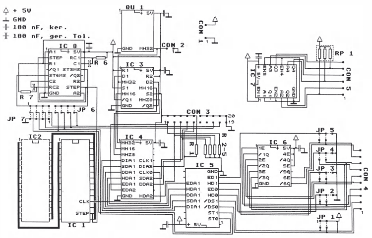 (wenn das Signal für ED z. B. an Pin 6 des Shugart-Busses anliegt, wird der EO-6-Jumper gesetzt usw.), hat man einen wunderbaren Signalabgriff und muß keine Kabel auftrennen. Die 5 V sind nur für den Pullup-Widerstand für das HD-Signa1, der in Teac-Laufwerken nicht vorhanden ist. Dieser Widerstand, R 8, kann weggelassen werden, wenn er schon auf dem Laufwerk vorhanden ist. Wenn man die Platine nicht direkt an das Laufwerk stecken möchte (die Platine ist übrigens für ein Teac-Laufwerk konzipiert), kann man anstelle von „CON 6“ auch eine gerade Stiftleiste einsetzen. Dann muß man sich jedoch mit einem kleinen Flachbandkabel behelfen, um das Laufwerk anschließen zu können. Die drei Jumper auf der Platine haben nur den Zweck, die Signale, die von den Pins 2, 4 und 6 des Shugart-Busses kommen oder abgehen, vom restlichen Bus zu trennen, damit sie sich nicht gegenseitig stören. Wenn man die HD-und ED-Signale z. B. auf den Pins 4 und 6 ausgibt, öffnet man einfach JP 12 und JP 13. Auf dieser Platine werden übrigens alle Bauteile auf der Bestückungsseite bestückt. Zur Isolierung des ganzen ist eine untergeklebte Pappe sehr gut. Die entsprechenden Anschlüsse von „CON 8“, einer Stiftleiste, kann man über eine Buchsenleiste und mit etwas Kabel sehr gut mit den entsprechenden Pins von „CON 4“ auf den Modulen verbinden. Nachdem man nun das Laufwerk richtig gejumpert, richtig angeschlossen und sorgfältig die Signale mit dem Modul verbunden hat, jumpert man das Modul, also den Autostep und die Eingangssignale für das Laufwerk korrekt (sind die HD-und ED-Signale active high oder active low?) und wagt den ersten Testlauf noch im fliegenden Aufbau (Vorsicht vor dem Netzteil, an den Bauteilen liegen Hochspannungen an!). Wenn der Rechner jetzt mit einer DD-Diskette bootet, hat man das Gröbste hinter sich. Bootet er nicht, wenn das Laufwerk angeschlossen ist, überprüft man noch einmal, ob alle Leitungen und Jumperungen korrekt sind. Falls das Modul vorher, ohne Laufwerk, lief, kann es nur an der Verkabelung liegen. Falls es partout nicht funktioniert (haben Sie vielleicht nur den Floppy-Stecker falsch herum eingesetzt?), können Sie sich noch an den Autor (Adresse u. Telefon siehe unten) oder die Redaktion der ST Computer wenden.
