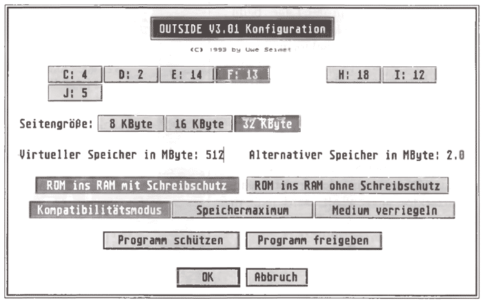 Normalerweise wird die standardmäßig vorgenommene Konfiguration für den Betrieb mit OUTSIDE ausreichend sein, es gibt jedoch weitere Einstellmöglichkeiten. So ist die Seitengröße, d.h. die Minimalgröße eines auszulagernden Blocks, variabel. Auch lassen sich inkompatible Programme vor Auslagern schützen, und die Größe des zusätzlich installierten Speichers läßt sich begrenzen. Auch die Größe des von OUTSIDE verwalteten Hauptspeichers läßt sich festlegen, so kann man etwa veranlassen, daß OUTSIDE von den 4 MB TT-RAM eines TTs 2 MB verwendet und mit Hilfe von 10 MB Plattenplatz daraus 10 MB virtuellen Speicher „macht" (man kann sich vorstellen, daß 2 MB Speicher als Cache für 10 MB Plattenspeicher verwendet werden). Wenn man größere Geschwindigkeitseinbußen in Kauf nimmt und „knapp bei Kasse" ist, kann man wahlweise den Plattenplatz zusätzlich zum Hauptspeicher anlegen, in unserem Beispiel wären das dann 12 MB.
