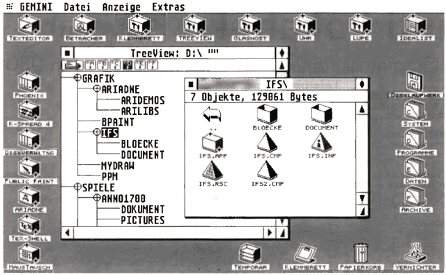 Das ganze wäre jetzt zwar schon ganz nett, aber einen Sinn hat es ja bisher nur sehr begrenzt. Es können zwar auf schöne Weise Verzeichnisbäume betrachtet werden, aber wenn dies alles wäre ... Nun, wird TreeView nicht unter dem Standard-Desktop des TOS, sondern unter dem Ersatz-Shareware-Desktop Gemini betrieben, erweitern sich die Anwendungsmöglichkeiten durch gezielte Zusammenarbeit enorm.