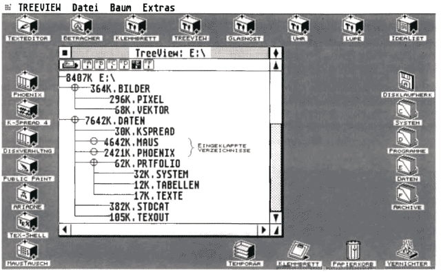 TreeView ist ein Programm, das auf keinem AT ARI fehlen sollte, auf dem auch die Gemini-Shell läuft. Es erleichtert die Arbeit mit vielen Ordnern auf der Festplatte enorm und ist bei mir binnen kurzer Zeit zu einem Standardwerkzeug geworden.