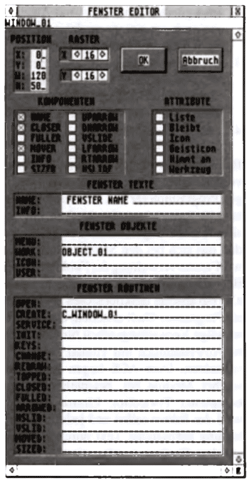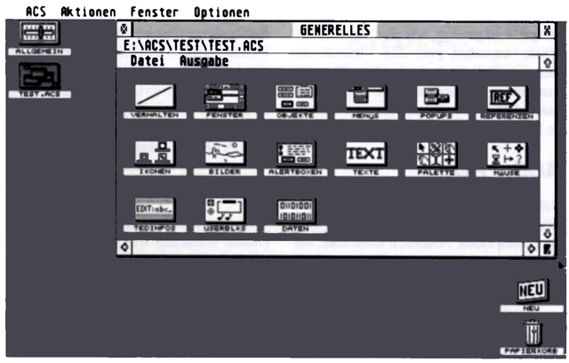 Nein. Das ACS ist kein Resource Construction Set, und es beinhaltet dem Sinn nach auch keins. Natürlich kann man, auf ähnliche Art und Weise wie in einem RCS üblich, seine Dialoge und Menüs entwerfen, aber diese werden nicht als separate Dateien abgelegt, sondern sie sind Teil des Ganzen, werden also ebenso wie Quelltextsegmente in die gesamte Applikation integriert. Damit die Arbeit der letzten Jahre nicht völlig umsonst war, können auch bereits erstellte Resource-Dateien geladen und quasi als Ersatzteillager verwendet werden. ACS ist im Konzept objektorientiert. Eine Anwendung oder ein Teil einer Anwendung ist ein Objekt mit ganz besonderen Eigenschaften, und zu diesen zählen Datenbereiche aller Art, Eingaben, Ausgaben und eben auch die Beschreibung der äußeren Erscheinung des Objekts, also der Dialoge, Menüs und was eben so dazu gehört.