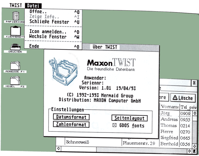 Zweifelsohne gibt es bereits einige Datenbanken im ATARI-Markt. „Warum bringt MAXON dann eine weitere heraus?", stellte sich die erste Frage. „TWIST ist einfach anders," sagte der MAXON-Mann, „drei Grundsätze waren den TWIST-Entwicklern wichtig: Bedienungsfreundlichkeit, Flexibilität und Geschwindigkeit". Wir haben das Produkt diesbezüglich unter die Lupe genommen.