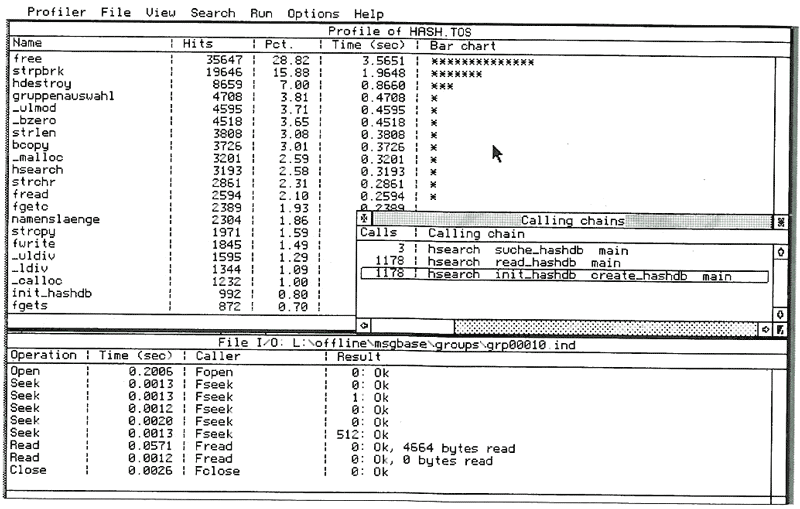 Das obere Fenster stellt die Ausführungszeiten der programminternen Funktionen dar, unten sieht man die I/O für eine bestimmte Datei, rechts, im kleinen Fenster, die Aufrufkette von main bis zu hsearch.
