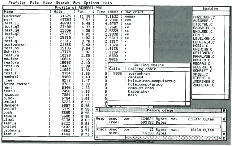 Bislang gab es auf dem ATARI außer dem relativ unkomfortablen und langsamen GNU-C-System mit prof- und gprof-, dem time-Kommando oder gar dem Messen per Stoppuhr keine Möglichkeit, eigene Programme schnell und effizient nach Engpässen im Laufzeitverhalten zu untersuchen. Diese Lücke versucht der Pure Profiler zu schließen.