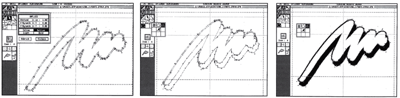 Ein Problem bleibt dennoch offen und läßt sich im Moment auch durch externe Module noch nicht lösen. Für unser Siebdruckvorhaben KFZ-Aufkleber und Planen mit immerhin 160x 120cm Größe müssen wir auf die bereits erwähnte Alternative „Folienplotter" ausweichen und für diesen Arbeitsgang das „m" mit einer „echten" Outline versehen. Daß heißt, daß die Strichstärke der Outline nicht durch Pixel errechnet, sondern durch Vektoren auf beiden Seiten der Linie beschrieben werden muß. Auf diesen Vektoren schneidet das Messer des Plotters.