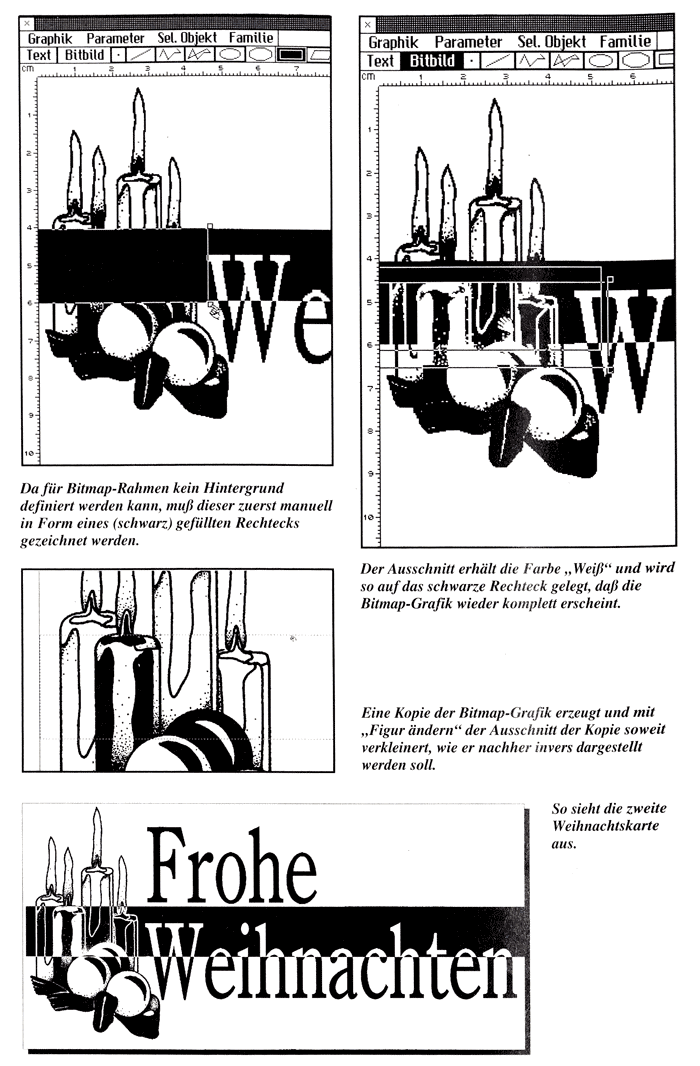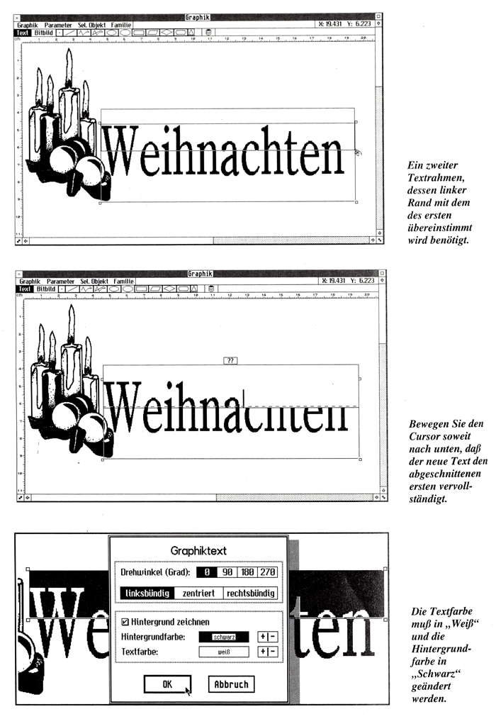 Sie ziehen also den ersten Textrahmen auf und schreiben den Text, zum Beispiel das Wort „Weihnachten“. Nun ziehen Sie einen zweiten Textrahmen auf, dessen linker Rand mit dem des ersten Rahmens übereinstimmt. Dazu selektieren Sie am besten vorher den ersten Textrahmen, dann haben Sie dessen Ränder stets sichtbar vor sich. Der neue Textrahmen durchschneidet mit seiner unteren Kante den bereits geschriebenen Text an der Stelle, ab der nachher invers geschrieben werden soll. Die Höhe des Textrahmens entspricht der Höhe des schwarzen Balkens, der nachher die Karte durchzieht. Nachdem Sie den Textrahmen in den richtigen Abmessungen aufgezogen haben, bewegen Sie den Cursor soweit in eine Indexposition nach unten, daß der nun noch einmal eingegebene Text den abgeschnittenen ersten Text wieder vervollständigt. Nun müssen Sie noch die Textfarbe in „Weiß“ und die Hintergrundfarbe in „Schwarz“ umändern. Sie haben jetzt also zwei Textboxen, die denselben Text enthalten. In der Box im Hintergrund wäre der Text vollständig sichtbar, würde der obere Teil nicht durch eine zweite Textbox abgedeckt, die jedoch genau das Bruchstück des Textes wieder zeigt, das sie abdeckt.