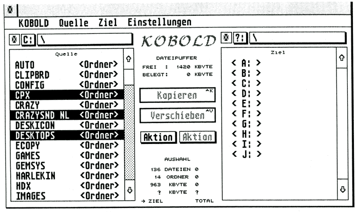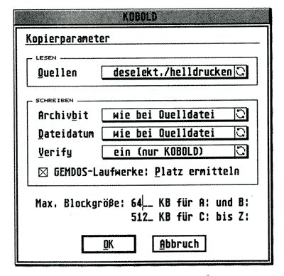 Der Kobold ist wohl eines der bekanntesten Utilities auf dem ATARI-Markt. Mit dem Kobold ist es möglich, die langsamen Kopierroutinen des Desktops zu umgehen und mit höchster Geschwindigkeit Dateien zu kopieren. Der Kobold kann aber noch viel mehr: Mit ihm ist es möglich, ganze Backups auf Wechsel- oder andere Festplatten zu erzeugen, Dateien nach bestimmten Kriterien zu selektieren, Ordner anzulegen und zu manipulieren sowie die Dateiflags zu setzen. Außerdem beherrscht der Kobold alle gängigen Diskettenformate in Wort und Schrift, das heißt, er kann diese sowohl lesen als auch mit seiner Formatierroutine erzeugen. Besonders am Kobold ist, daß er sich auch mittels der sogenannten „Jobverwaltung“ zum automatisierten Arbeiten eignet. So lassen sich beispielsweise Backups oder größere Kopieraktionen, die trotz der hohen Geschwindigkeit etwas länger dauern, automagisch in der Mittagspause durchführen oder, wenn man das zum Kobold gehörende Programm „Jobtimer“ einsetzt, sogar mittels dessen Zeitsteuerung zu einer beliebigen Zeit beginnen lassen. Unter Multitaskingumgebungen wie MultiTOS oder MagiX! laufen die Kopieraktionen des Kobolds sogar völlig im Hintergrund ab, so daß man während des Kopierens problemlos Weiterarbeiten kann. Der Hauptvorteil des Kobolds ist aber seine Geschwindigkeit: Da das Programm nicht auf die GEM-DOS-Routinen des Betriebssystems zurückgreift, sondern selbst die Verwaltung des Massenspeichers übernimmt und direkt auf dessen physikalische Struktur zugreift, wird die Geschwindigkeit schwindelerregend. So sind Geschwindigkeitszuwächse gegenüber dem Betriebssystem von bis zu 700% beim Kopieren keine Seltenheit. Gerade beim Löschen und Verschieben von vielen Dateien innerhalb eines Laufwerks wird dies besonders deutlich: Während das Betriebssystem hier zum Genuß einer Kanne Kaffee einlädt, ist der Kobold quasi sofort mit seiner Arbeit fertig und gönnte dem Benutzer nicht auch nur den Hauch einer Pause. Lediglich bei Laufwerken, die einen eigenen Treiber benötigen (z.B. Netzwerke oder CD-ROMs) funktioniert diese Methode nicht, so daß der Kobold hier von selbst auf den entsprechenden Betriebssystem-Modus umschaltet und damit auch die Benutzung dieser Medien ermöglicht. In der erst kürzlich erschienenen Version 2.5 sind noch einige weitere nützliche Funktionen hinzugekommen. So werden nun Lese- oder Schreibfehler selbstständig erkannt und, soweit möglich, auch korrigiert. Dadurch bricht das Programm z.B. bei unbeaufsichtigten Backups nicht einfach ab, sondern führt, genügend weitere freie Sektoren auf dem Zeillaufwerk vorausgesetzt, dieses einfach fort und markiert die fehlerhaften Sektoren in der FAT als defekt. Die Möglichkeit, Disketten im Hintergrund zu formatieren erweist sich hingegen mehr als Gimmick denn als praktisch nutzbare Neuheit, da der Rechner nur in den Pausen zwischen den einzelnen Spuren für andere Applikationen Rechenzeit abzweigen kann. Außerdem wurde die Bedienung überarbeitet, so daß der Kobold nun dank Laufwerksauswahl im Dateifenster und „intelligentem“ AktionsPop-Up noch schneller zu bedienen ist. Der Kobold ist sowohl als Programm als auch als Accessory lauffähig und steht so auch ohne Multitasking immer zur Verfügung. Der Preis des Kobolds ist mit 129,-DM sicher für ein Hilfsprogramm hoch, aber in allen Belangen angemessen, so daß man diesen flinken Wicht eigentlich jedem ATARIaner ans Herz legen sollte.