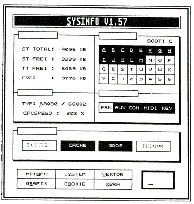 „Wie war das doch gleich? Welche residenten Programme sind installiert? Wieviel Speicher haben Sie im Betrieb frei? Was hängt eigentlich in welchem Systemvektor?“ Fragen, die nicht nur Programmierer, sondern bevorzugt Mitarbeiter einer Anwender-Hotline gerne stellen, um einen nervenden Kunden erst mal ein wenig ruhigzustellen. Gut, wenn man dann das Programm SysInfo von Thorsten Bergner hat. Damit lassen sich alle diese Fragen mit einem Knopfdruck beantworten und außerdem viele nützliche Dinge über das System erfahren. So kann das Programm die „Keksdose“ (besser bekannt als Cookie-Jar) der neuen TOS-Versionen auslesen und die entsprechenden Einträge dort anzeigen. Außerdem werden die Einträge vieler weiter verbreiteter Programme dabei noch in Klarschrift kommentiert, so daß man nicht auf die eher kryptische -Vier-Buchstaben-Kombination des Cookies schauen muß. Außerdem gibt das Programm Informationen über den installierten Prozessor und eine eventuell vorhandene CPU sowie über dessen Geschwindigkeit im Vergleich zu einem 8-MHz-ST. Dieser angegebene Prozentwert ist aber mit Vorsicht zu genießen: Auf einem TT mit Grafikkarte kam das Programm auf ca. 300%, während auf einem mit nur einem MHz mehr getaktetem SST-Board im Mega ST (allerdings auch dort im Fast-RAM laufend) die Kleinigkeit von 434% angezeigt wurde (was aber subjektiv nicht der Wahrheit entspricht). Auf dieser exotischen Hardware-Kombination gab es außerdem noch Probleme, den Speicher zuzuordnen: So behauptete Sys-Info dort glattweg, daß von den seiner Meinung nach vorhandenen 2 MB noch genau 3,7 frei wären, während es die tatsächlich vorhandenen 4 MB TT-kompatibles Fast-RAM einfach verschluckte, obwohl das Programm darin ablief. Auf dem TT und „normalen“ STs (mit 60000er Prozessor in beliebigen Taktraten) waren hingegen beim Speicher die richtigen Werte abzulesen. Nützlich ist auch der Menüpunkt „HDInfo“. Hier kann man für alle Partitionen ablesen, wieviel Speicher genau noch frei ist und wieviel insgesamt an Speicherplatz im System zur Verfügung steht. Dadurch kann man Engpässe auf einzelnen Partitionen schnell und zuverlässig erkennen und beheben. Etwas ärgerlich ist, daß bei SysInfo modale Dialogboxen Verwendung finden, die unter Multitasking-Systemen den Task-Wechsel zuverlässig verhindern. Hier ist allerdings, im Gegensatz zu XInfo, die Notwendigkeit, dies zu ändern, nicht gar so hoch, da das Programm ja nur hin und wieder zum Einsatz kommen soll, um unerklärliche Abstürze zu ergründen oder eben die Installation neuer residenter Software zu überprüfen. SysInfo ist PD und somit kostenlos zu bekommen. Für den Notfall ist es also auf jeden Fall gut, dieses Programm auf der Festplatte liegen zu haben, damit man den kleinen Tücken des ATARI-Alltags ein wenig näher auf die Schliche kommen kann.