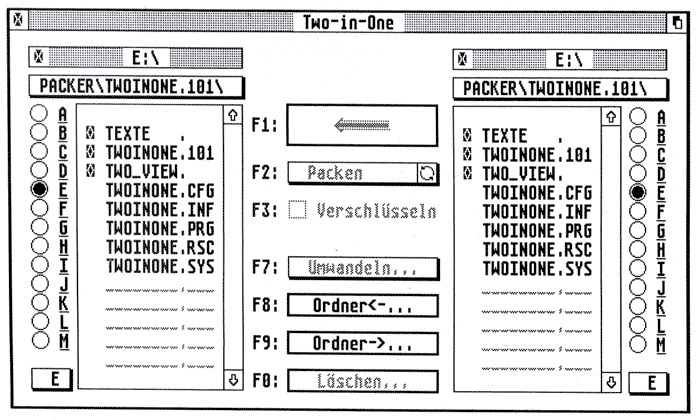 Die gebräuchlichen Archivierungsprogramme (auch Packer genannt), die es zur Zeit für den ST gibt, haben allesamt mit Ausnahme des STZIP keine GEM-Oberfläche, sondern werden über eine Kommandozeile gesteuert, was auf ihre Herkunft aus dem DOS-Bereich zurückzuführen ist. Um die Benutzung dieser Programme komfortabler zu machen, gibt es seit geraumer Zeit einige Programme, die mit einer GEM-Oberfläche die Funktionen dieser Packprogramme steuern. Wenn nun hier von Two-in-One die Rede ist, so sprechen wir nicht von einem neuen Haarwaschmittel, sondern von einer relativ neuen sogenannten Packer-Shell. Two-in-One ist Freeware, das heißt, daß auch die regelmäßige Benutzung dieses Programms keine Gebühr kostet, und liegt seit kurzem in der Version 1.01 vor. Mit Two-in-One lassen sich alle gängigen Packer auf dem ST steuern: Es werden der „neue“ LHarc von Christian Grunenberg (Version 2.2x), der STZIP von Vincent Pomey, die Zoo-Implementation 2.x von Gereon Steffens, Arc 6.02 und zwei Versionen des UNARJ unterstützt. Außerdem kann das Programm mit den zu ZIP und LHarc gelieferten Programmen umgehen, die aus einem Archiv eine selbstextrahierende Programmdatei machen und so mit deren Hilfe gerade gepackte Archive in diese Form umwandeln. Für die Datenfernübertragung unterstützt das Programm auch noch das UUE-Verfahren, mit dem binäre Dateien in eine im ASCII-Format lesbare Form verwandelt werden. Dies ist notwendig, um Programme oder andere binäre Dateien über Datenfernübertragungsleitungen verschicken zu können, die nur mit einer Bandbreite von 7 Bit arbeiten (z.B. die meisten Großrechner). Two-in-One ermöglicht es, für jedes der Packprogramme bis zu 26 Optionen vorzuwählen und die gewünschte Einstellung abzuspeichern, damit sie beim Programmstart immer sofort verfügbar ist. Die Optionen für die einzelnen Archivierungsprogramme lassen sich bei Bedarf auch noch erweitern, so daß auch zukünftig kommende Funktionen kein Hindernis für das Programm darstellen werden: Ein Eintrag der zusätzlichen Option in ein Text-File genügt. In Sachen Bedienung orientiert sich das Programm am STZIP oder dem weiter unten erwähnten Kobold: In einem Fenster werden die Dateien des Quell- und des Ziellaufwerks in einem eigenen Kasten angezeigt. Wählt man nun im Quellkasten ein Archiv aus, so werden die Dateien des Archivs in diesem Kasten angezeigt. Mit der Maus wählt man nun die Dateien aus, die ausgepackt (oder eingepackt) werden sollen und betätigt den Startknopf. Two-in-One legt sofort los und holt die gewünschten Dateien aus den Archiven heraus. Einfacher geht es wohl kaum noch, allerdings hat das Programm ein paar kleine Macken: So wird, obwohl installiert, bei den Bildschirmausgaben der Packer nicht der Mag!X VT52 benutzt, der auch bei TOS-Programmen ein Multitasking ermöglicht. Statt dessen wird ein eigenes Verfahren zur Umlenkung der Ausgaben in ein Fenster verwendet, das für die Zeit des Ein- oder Auspackens das Multitasking unterbindet. Hier sollte der Autor noch einmal ein wenig Zeit investieren. Ansonsten aber ist das Programm uneingeschränkt zu empfehlen.