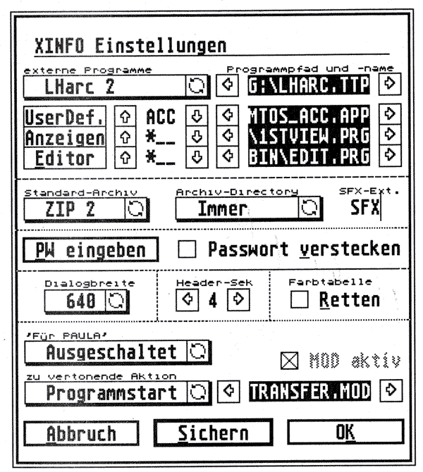 Die letzte Version von XInfo wurde bereits in [1] ausführlich besprochen, doch inzwischen hat der Autor Oliver Schildmann das Programm weiter überarbeitet und einige neue Funktionen eingebaut. XInfo ist ein klassisches Multi-Utility und verbindet viele kleine Hilfen zu einem kompakten Programm. So kann XInfo Archive packen und entpacken sowie deren Inhalt auflisten (freilich nicht so komfortabel wie Two-in-One), Informationen über Dateien anzeigen und diese auch verändern, Dateien ver- und entschlüsseln oder für die Datenfernübertragung in das UUE-Format übertragen, Informationen über Calamus oder Didot-Fonts geben und noch vieles mehr. Das Programm bietet so viele Möglichkeiten unter einem Dach, daß es unmöglich ist, sie hier alle aufzuzählen. Insbesondere unterstützt das Programm diverse andere Utilities direkt und ruft diese ggf. auf, um deren Funktionen zu nutzen: es sind ein Virenkiller, das Grafikanzeigeprogramm Gemview oder der MOD-Player Paula. Damit lassen sich dann Programme auf Viren überprüfen, alle gängigen Grafikformate direkt aus XInfo heraus ansehen und MOD-Files abspielen. Zwar mag es für die einzelnen Disziplinen Experten geben, die diese Funktionen besser lösen, doch kann kein anderes Programm mit einer derartigen Vielfalt aufwarten. Die Version 1.0 bietet nun neben der Unterstützung des neuen FHarcs einige neue Dateiformate, die vom Programm angezeigt werden können sowie eine komplett überarbeitete ALIAS-Funktion, die Dateien in mehreren Ordnern ablegt, aber pro zusätzlichem Verzeichnis der Festplatte nur noch 2 KB Speicher abverlangt.