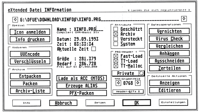 XInfo ist komplett in GFA-BASIC geschrieben, und obwohl diese Programmiersprache nicht gerade den Ruf eines Saubermanns in Sachen GEM-Konformität genießt, läuft XInfo sogar unter Mag!X einwandfrei. Ärgerlich ist aber, daß das Programm seine Ausgaben in modale Dialogboxen macht, so daß während des Benutzern von XInfo andere Applikationen unter Mag!X oder MultiTOS nicht mehr zugänglich sind. Dies ist zwar nicht unbedingt ein großer Mangel, da XInfo ja nur bei Bedarf gestartet werden muß, sollte aber als kleine Unschönheit auf jeden Fall in Betracht gezogen werden. Der Preis von XInfo ist jedoch eindeutig ein Pluspunkt: Das Programm ist Shareware und kann so nach Herzenslust getestet werden. Benutzt man es regelmäßig, gibt es beim Autor für nur 20 DM eine persönliche registrierte Version. Das Geld wert ist das Programm alle Mal und ersetzt so manches andere Utility.