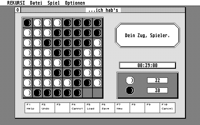 Rekursi ist ein solches Spiel. Ein Brettspiel, genauer gesagt eine Umsetzung des Spiels Othello, auch Reversi genannt. Hierbei werden auf einem 9x9 oder 10x10 Felder großen Spielbrett Steine der eigenen Farbe so gelegt, daß sie in einer Reihe mit Steinen des Gegners und eines eigenen Steines liegen, also beispielsweise Weiß-Schwarz-Schwarz- Weiß. Diese Reihe kann horizontal, vertikal und diagonal gebildet werden. Nun werden alle gegnerischen Steine, die zwischen zweien der eigenen Farbe liegen, umgedreht und somit zu eigenen - daher der Name Reversi. Und am Ende, wenn das Spielbrett voll ist, hat derjenige gewonnen, dem die meisten Steine gehiiren. Durch das ständige Umdrehen der Steine ist aber meist bis zum Ende nicht ganz klar, wer gewinnen wird, da ein einziger Stein große Teile des Brettes noch zu "kippen" bringen kann. Rekursi ist nun eine Umsetzung dieses Spielprinzips auf den ATARI. Es hat hierbei eine Komplexität gewonnen, wie man sie sonst nur von Schachspielen und allenfalls von Go! kennt. Selbstverständlich ist Rekursi vollständig in die Benutzeroberfläche GEM eingebunden, macht keinerlei Probleme mit Grafikkarten, MultiTOS und anderen Multitasking-Umgebungen. Es wurden alle Dialoge in Fenstern ausgeführt, was die Ver- wendung im Multitasking noch weiter erleichtert. Ganz nebenbei ist Rekursi übrigens auch als Accessory lauffähig.