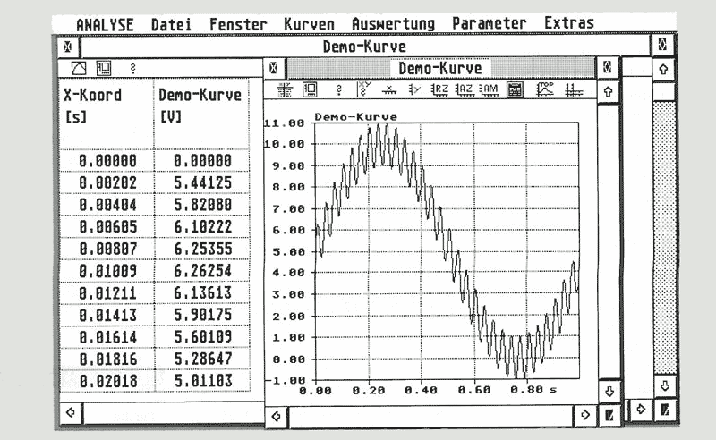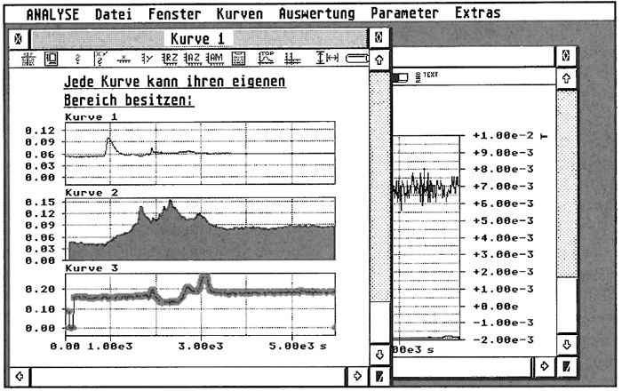 Die oberste Bildschirmzeile nehmen - wie gewohnt - die Drop-Down-Menüs Datei, Fenster, Kurven, Auswertungen, Parameter und Extras ein, die wir allesamt im folgenden genauer betrachten wollen. Das Menü "Datei" dient - wie der Name sagt - zur Steuerung der Ein- und Ausgaberoutinen des Programms. Zur manuellen Dateneingabe ist ein komfortabler Werteeditor vorhanden, den Sie entweder per Werteeingabe über die Tastatur oder in grafischer Form per Maus in einem geeigneten Diagramm (nach Bestimmung der Wertebereiche) bedienen. Der Import und Export (einschließlich Kompression) von Meßdaten ist auf zweierlei Arten möglich: einmal als reine ASCII-Datei mit individuell bestimmbarer Formatkennzeichnung (Anordnung in Zeilen oder Spalten etc.) sowie als RBF-Datei (rhothron binary format), bei dem die einzelnen Daten in ihrer entsprechenden Datenbreite verarbeitet werden.