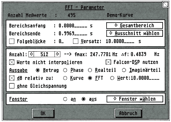 Ein äußerst wichtiger und - wie wir meinen - hervorragend implementierter FFT-Algorithmus erlaubt die Fast-Fourier-Transformation zur Frequenzanalyse von Signalen. Beim Einsatz des Programms auf einem Falcon übernimmt der interne DSP die Berechnung der FFT per externem LOD-File, wobei das Programm automatisch - für den Anwender unbemerkt - den DSP konfiguriert (Begrenzung auf 2048 Stützstellen). Grundsätzlich besteht bei der FFT mit rho-Analyse die Möglichkeit. die Ausgabe nach Betrag (in db), Phase, Real- und Imaginärteil aufzuteilen, wobei der Gleichspannungsanteil ausgeblendet werden kann.