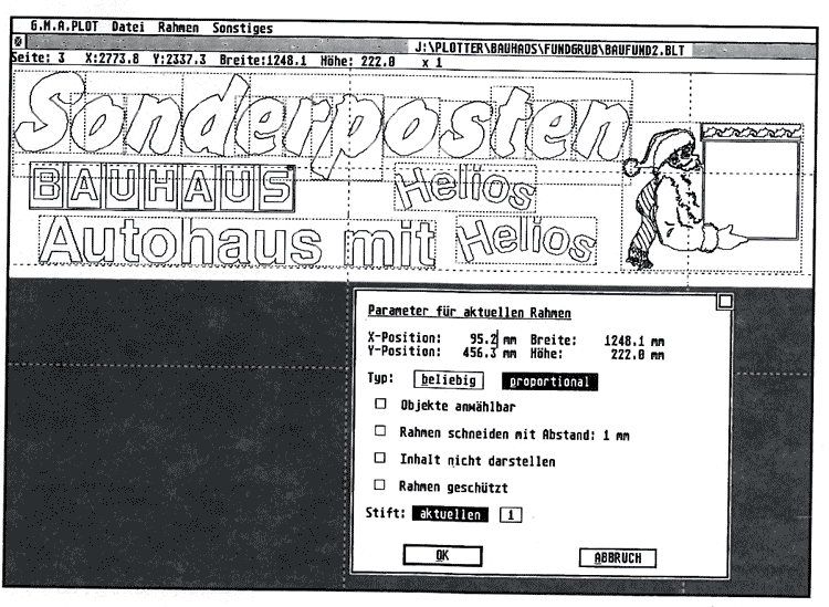 Richtig komfortabel gestaltet sich die Plotausgabe, wenn der Plotter bei der Arbeit mit G.M.A. Plot nicht über die parallele, sondern über die serielle Schnittstelle angeschlossen wird. Auf diesem Wege kann die Plottfläche (entsprechend der gerade einliegenden Folienbreite) direkt im Programm als Montagefläche dargestellt werden. Aber auch über die parallele Schnittstelle läßt es sich mitG.M.A.-Plot schnell und komfortabel arbeiten.