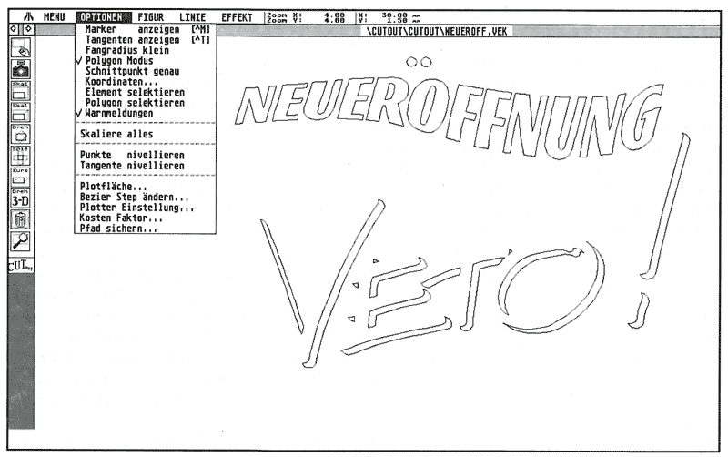 Wir wollen hier einmal drei Softwareprodukte genauer untersuchen, die sich für einen professionellen Plotterbetrieb anbieten, sich ansonsten aber in der Konzeption völlig voneinander unterscheiden: „G.M.A. Plot" von der Hamburger Firma G.M.A., das ohne eigene Editorfunktionen die Montage bereits vorhandener Vektorobjekte und deren Ausgabe auf den Plotter regelt; CutOut von Arrow-Computer, einer Software, die vom Scannen über Vektor- und Font-Arbeiten bis zur Plotterausgabe alle Funktionen in einem Programm vereinigt; sowie „Cut+Plot" von Frank Renkes, das als Modul im Calamus seinen Dienst verrichtet, und so natürlich auf alle bereits im Calamus vorhandenen Funktionen zugreifen kann.