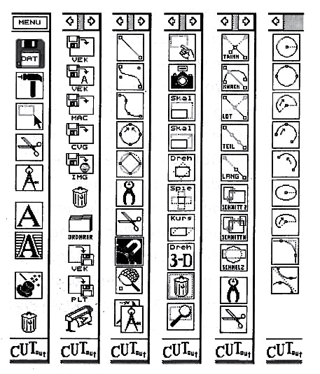 Cutout ist eine Software, die alle für den Plotbereich relevanten Werkzeuge in einer Programmoberfläche zu vereinen sucht. Dem Programm liegt also ein völlig anderes Konzept zugrunde, als gerade in G.M.A. Plot kennengelernt. Im Programm befindet sich ein vollständiger und sehr gut ausgerüsteter Vektoreditor für die Erzeugung oder Modifikationen von Vektorobjekten, ein Autotracer zum automatischen Vektorisieren von Scans, die über optionale Treiber auch direkt vom Scanner ins Programm eingelesen werden können, sowie ein Font-Editor.