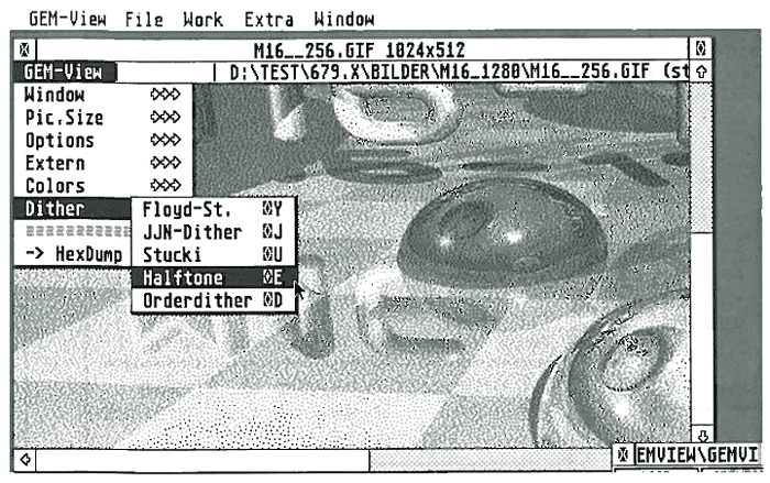 Und auch bei der Anpassung eines geladenen Bildes an die gerade aktive Bildschirmauflösung ist bei GEM-View alles Wichtige und Nützliche vorhanden: sollte der Bildschirm weniger Farben haben als das Bild, so wird es durch "Dithern", das Ersetzen einer Farbe durch geschicktes Gegeneinandersetzen von Farben aus der Zielpalette, auf die entsprechende Farbenzahl heruntergerechnet. Hierfür stehen mehrere Verfahren zur Verfügung, die unterschiedlich gut und schnell arbeiten. Besonders hervorzuheben ist das Ordered-Dither-Verfahren, da hierbei mit Hilfe eines mitgelieferten Editors sogenannte Dither-Muster selbst erstellt werden können, anhand derer GEM View dann die Bilder umrechnet. Mit dieser Funktion lassen sich nicht nur recht gute Ergebnisse, sondern auch äußerst interessante Effekte erzielen. Allgemein kann man aber sicherlich sagen: hier ist Ausprobieren gefragt, welches Verfahren mit einem bestimmten Bild die besten Ergebnisse liefert.