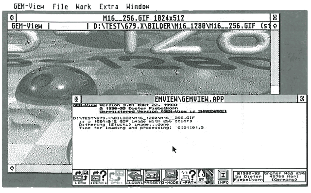 Wie Sie sehen, ist GEM-View nicht gerade spartanisch ausgestattet. Und selbst bei den mitgelieferten Utilities gibt es noch einiges Bemerkenswerte: Winx 2.1 für mehr als 8 Fenster und eine verbesserte Fensterbedienung, ein Editor für Dither-Muster (siehe weiter unten) sowie das Programm VDIFix zur Behebung eines Fehlers im GEM.