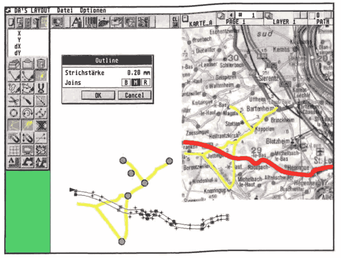Ganz neu ist die automatische Erzeugung von Outlines und das Joinen von Vektorpfaden. Diese Funktionen machen DA's Layout mit allen anderen Werkzeugen zu einem äußerst hilfreichen Werkzeug für die grafische Arbeit. Mir ist kein anderer Vektoreditor bekannt, der die hier vorzufindenden Möglichkeiten in einer einzigen Programmumgebung bietet. Die praktische Anwendung von „echten Outlines" zeigt sich nicht nur beim Folien-Plotten - hier natürlich besonders und unverzichtbar. Schon kleine Wegweiser oder Stadtpläne, auf Broschüren und Anzeigen oft zu finden („so finden Sie zu uns waren bisher als reine Vektorobjekte nicht einfach zu erzeugen. Man kann sich bei derartigen Gestaltungsarbeiten zwar mit unterschiedlichen Strichstärken helfen, also: Straßen als Vektorlinien zeichnen, z.B. 4p Strichstärke, schwarz, Fläche transparent. Dann eine 1:1-Kopie genau über die erste Anlage gelegt, Strichstärke 2p, weiß. Fertig waren die Straßennetze mit schönen Doppellinien. Was aber nun, wenn diese Grafik zum Beispiel aus DA's Layout in den Calamus importiert werden sollte? Die CVG-Formate von DA's Layout und Calamus sind immer noch nicht bis ins letzte kompatibel, was sich eben auch durch eine nicht korrekte Übernahme der Linienstärken bemerkbar macht.