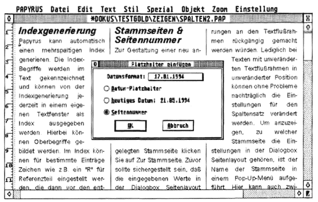 Papyrus bietet dem Anwender einen onlineformatierenden Spaltensatz mit vollem WYSIWYG (die Bildschirmanzeige entspricht dem Ausdruck). Der Spaltensatz steht wie die Textobjekte auch in der Grundversion von papyrus zur Verfügung. In Zeitschriften hat meist jede Seite ein anderes Layout. Mit der GOLD-Erweiterung besteht für derartige Layouts die Möglichkeit, beliebig viele Stammseiten zu definieren und bestimmten Textseiten zuzuweisen. Sobald z.B. über den Dialog „Seitenlayout“ mehrere Spalten für den Spaltensatz eingestellt werden, können die Rahmen der einzelnen Spalten frei positioniert und mit Objektgriffen in Größe und Form verändert werden. In Verbindung mit weiteren Textobjekten können somit selbst komplizierte Zeitungs-Layouts gestaltet werden. Ein Standardbeispiel wäre bei einem dreispaltigen Layout die Verkürzung von zwei oder drei Spalten am oberen Ende, um für ein Bild oder eine abgesetzte Textbox Platz zu machen.
