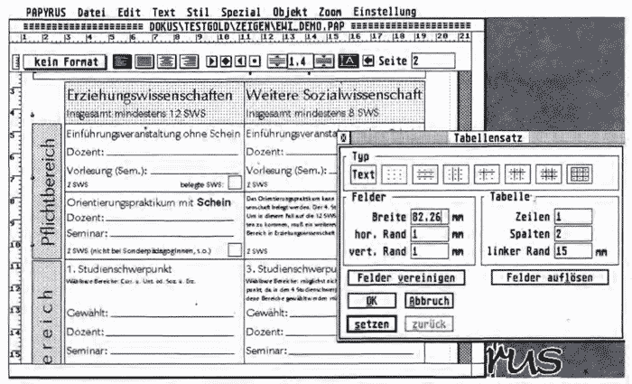 Sobald sich für den Anwender komplexere Gestaltungsaufgaben ergeben, hat papyrus einige Funktionen zu bieten, die sonst meist nur aus Layout-Programmen bekannt sind. Neben normalem Fließtext können frei positionierbare Textobjekte in den Text eingefügt werden, womit sich für die Gestaltung eine neue Dimension öffnet. Dies gilt insbesondere, da in Textobjekten alle Formatierungsmöglichkeiten vom Blocksatz bis zum Einzug zur Verfügung stehen.