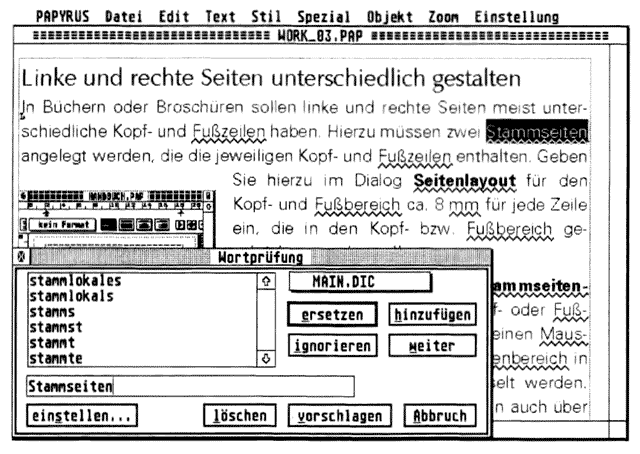Ab der Versionsnummer 3.5 steht den Anwendern der Grundversion und der GOLD-Erweiterung eine umfangreiche Wortprüfung zur Verfügung. Mit bis zu neun Wörterbüchern kann der Text auf Tippfehler durchsucht werden. Da papyrus bei vielen Funktionen etwas Besonderes bietet, darf auch hier ein Bonbon nicht fehlen: Auf Wunsch zeigt papyrus alle unbekannten Wörter im Text gleichzeitig mit einer gezackten Unterstreichung an. Dies hat den Vorteil, daß Texte wesentlich schneller korrigiert werden können. Zum Nachschlagen eines zweifelhaften Wortes genügt ein Rechtsklick auf den hervorgehobenen Begriff, und der Dialog zur Wortprüfung wird aufgerufen. Nach Abschluß der Korrektur können alle verbliebenen markierten Wörter gleichzeitig in ein Wörterbuch aufgenommen werden. Auf Wunsch kennzeichnet papyrus bereits während des Schreibens alle unbekannten Wörter.