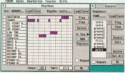 Die Eingabe von Rhythmen erfolgt in der "Rhythmsection" über einen sogenannten "Grid-Editor". In diesem Editor wird jeweils ein ganzer Takt in tabellarischer Form dargestellt (Bild 1). Die maximale Auflösung beträgt hier eine 32tel Note, wobei wir bei der ersten Einschränkung des Programmes sind. Für einfache Rhythmen mag das ausreichend sein. Um aber ein halbwegs realistisches Spielgefühl hervorzurufen, ist diese Auflösung zu gering. Professionelle Drumcomputer arbeiten hier mit 1/192tel-Noten oder noch höheren Auflösungen. Durch einen Mausklick in der Zeile eines Instrumentes wird die Note an die entsprechende Position innerhalb des Taktes gesetzt. Ein nochmaliger Klick löscht sie wieder. Ein Rhythmus wird dadurch grafisch am Bildschirm dargestellt, und man kann sich sehr gut in den Aufbau des Grooves hineindenken. Besonders wichtig ist dabei, daß der Rhythmus während der Noteneingabe in einer Endlosschleife abgespielt werden kann und jede Änderung dadurch sofort hörbar wird. Leider kann man im Grid-Editor keine Blöcke definieren, um mehrere Noten gleichzeitig zu bearbeiten (Verschieben, Löschen, Setzen, Intrument wechseln). Man ist gezwungen, für jede Note einen Mausklick anzusetzen. Je nach Komplexität der Rhythmen und der Änderungswünsche wird dies sehr schnell zu einer "wilden Klickerei". Es existiert allerdings eine Funktion, um alle Notenwerte innerhalb des Rhythmus auf einmal zu löschen. Zu jedem einzelnen Rhythmus lassen sich verschiedene Parameter einstellen. Zunächst natürlich das Tempo in bpm (beats per minute). Hier reicht die Skala von 60 bis 240 bpm, was für alle Anwendungsfälle (Slow Waltz bis Speed- Metal) ausreichen sollte. Auch die Taktart läßt sich ändern. Angeboten werden: 3/4tel, 4/ 4tel, 6/8tel, 5/4tel, 7/4tel und deren triolische Verwandte. Leider fehlt ein 2/4telTakt! 2/4tel? Wozu? Oft kommt es vor, daß innerhalb eines Songs ein Break oder Fill lediglich über einen halben Takt geht. Hier muß man sich behelfen, indem man einen 4/4tel-Takt mit doppelter Geschwindigkeit benutzt und die Notenpausen verdoppelt. Bei einem sehr schnellen Song geht das natürlich nicht mehr. Alle Einstellungen werden für jeden Rhythmus separat gespeichert. Dadurch ist es ohne weiteres möglich innerhalb eines Songs die Geschwindigkeit oder gar die Taktart zu ändern. Das macht Fdrum sehr flexibel bezüglich der Song-Zusammenstellung.