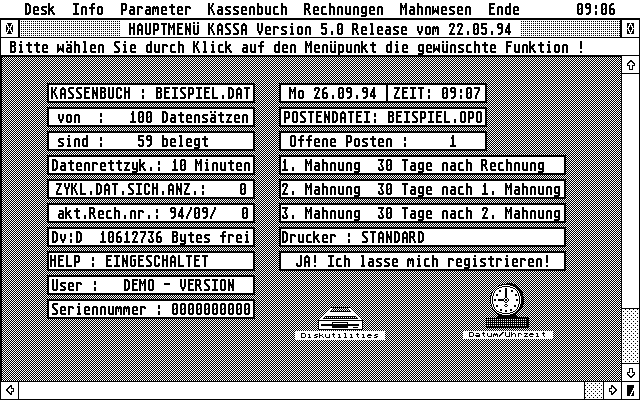 Jeder Gewerbetreibende kennt den Kleinkrieg mit dem Finanzamt. Da muß peinlichst genau jede Mark verbucht werden. Alles fein in Konten verpackt, damit die Jungs da auch durchblicken. Bei fünf Rechnungen im Jahr mag das ja alles kein Problem sein, aber spätestens ab 100 Rechnungen, egal ob Einnahmen oder -,Ausgaben, fängt die Arbeit mit dem Kontieren an. Hat man jetzt noch einen Laden, in dem ein Barverkauf stattfindet, ist man über jede Erleichterung froh. Kassa hat sich über die Jahre hin zu einer großen Hilfe für Gewerbetreibende entwickelt. Aktuell ist nun die Version 5, deren größte Veränderung die Anpassung an MultiTOS und die Unterstützung des Barverkauf-, als Modul ist. An dieser Stelle sei noch angemerkt, daß die älteren Versionen auf den PD-Disketten nicht mehr bestellt werden sollten! Der Autor gewährt auch nur denen Support, die registriert sind. Zu den weiteren Stärken von Kassa gehören noch die individuellen Briefköpfe für Rechnungen und Mahnungen, automatisches Sichern im Zeitintervall, Rechnungsnummern hochzählen, Änderungsmöglichkeit für fehlerhafte Datensätze, automatisches Mahnverfahren, Anzeige der offenen Posten mit allen Mahndaten und eine Verschlüsselung der Daten auf Diskette, damit sie keiner unbefugt anzeigen kann. Abgerundet wird das alles durch ein ausführliches Online-Help-System, das auf Wunsch auch abgeschaltet werden kann. Insgesamt stellt Kassa eine Hilfe dar, die auch für Kassierer in einem Verein nicht uninteressant ist, da immer die Übersicht über Beitrag, dessen Fälligkeit und säumige Mitglieder behalten werden kann.