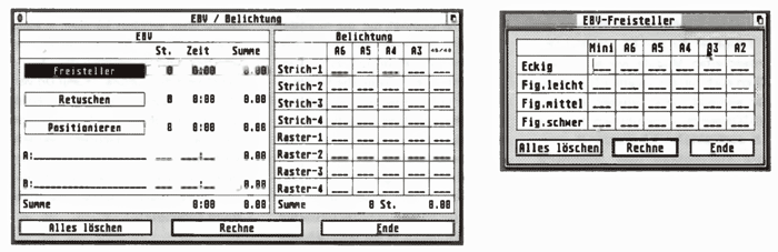 Bild 1 und 2: Einige der Formulare, die ‚repro kontor‘ zur Auftragsverwaltung zur Verfügung stellt. Die gesamte Produktion im Bereich EBV kann über eine differenzierte Zeiterfassung abgerechnet werden. Die Zeitwerte wie auch einige Tabellenbeschriftungen können individuell festgelegt werden.