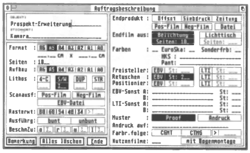 Bild 3: Die Auftragsbeschreibung. Aus den hier gemachten Angaben kann ein Auftragsbogen mit Arbeitsanweisungen ausgedruckt werden, der den Auftrag während der gesamten Produktion begleitet.
