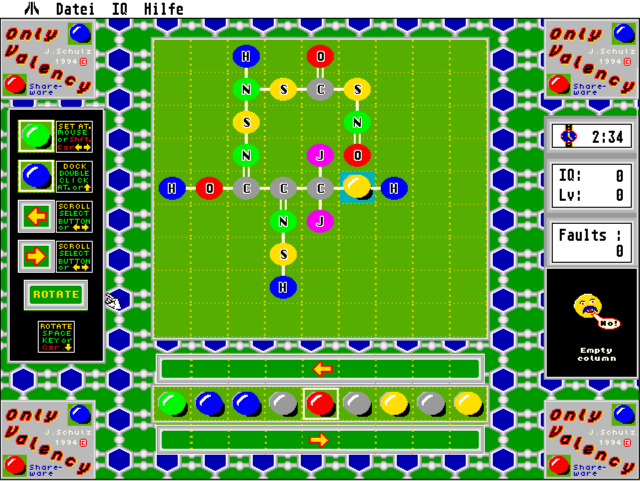 "Only! Valency" ist ein Brettspiel, in dem man Moleküle zusammenbauen muß. Dazu braucht man nicht die Kenntnisse eines Chemikers, aber eine schnelle optische Auffassungsgabe und Handlungsweise. Die Regeln sind recht simpel, allerdings können einem die verrinnende Zeit, sog. Fallouts und andere Erschwernisse reichlich zu schaffen machen. 300 Levels und eine strenge Bewertung (Valency-IQ) entscheiden darüber, ob Sie ein begnadeter Spieler oder nur ein No-name-Player sind. Level-Vergleiche mit anderen "Only! Valency"-Spielern dürften schnell zeigen, was Ihre Einträge wert sind. "Only! Valency" kann per Tastatur oder Maus gesteuert werden. Das Spielbrett besteht aus 9x9 Feldern, in welches das Molekül plaziert wird. Außerdem gibt es ein Atomvorratsfenster, in dem, max. 9 Atome sichtbar sind. Sinn des Spiel ist es, das vorgegebene Molekül möglichst schnell und ohne Strafpunkte zusammenbauen. "Only! Valency" setzt beim Start ein Atom per Zufall in die Molekülstruktur ein. Dieses Startatom ist der Ausgangspunkt für alle späteren Atomankoppelungen. Es darf nur an bereits eingesetzte Atome angekoppelt werden. Das Ankoppelatom ist im Vorratsfenster jeweils durch eine Einrahmung gekennzeichnet. Es wird per "Cursorhoch"-Taste an das nächste 3D-Atom der entsprechenden Brettspalte angekoppelt, allerdings nur dann, wenn alle Regeln hierfür erfüllt sind. Graue Pfeile im Spielbrett helfen dem Spieler, die aktuelle Spielspalte schneller zu erkennen. Man kann das ganze Molekül in 90'- Schritten drehen, und wenn alle Positionen stimmen, kann ein neues Atom in Richtung Molekül abgeschossen werden. Nach erfolgreichem Zusammenbau errechnet sich aus der verbrauchten Zeit und den eventuellen Fehlversuchen der Valency IQ.