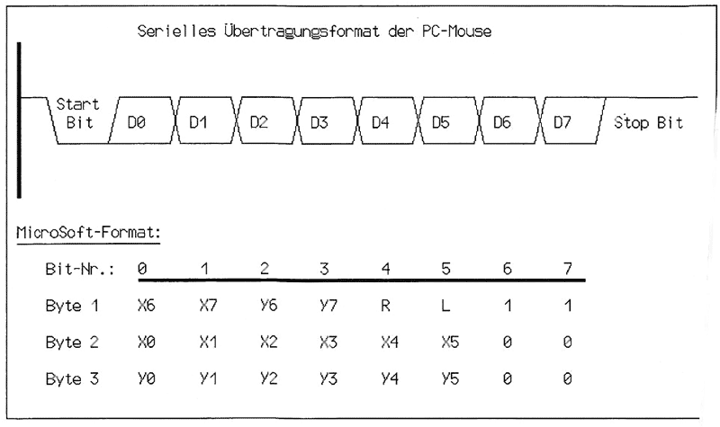 Die serielle Schnittstelle des Interfaces ist für eine MicroSoft-Maus programmiert. Bei jeder Bewegung oder bei Tastendruck werden drei Daten-Bytes übertragen (siehe Bild 2 MicroSoft-Format). Die meisten seriellen PC-Mäuse haben auf ihrer Unterseite einen kleinen Schalter, der auf das entsprechende Format, z.B. „MS“ für Microsoft oder „PC“ für PC-Format, gestellt werden kann. Das PC-Format wurde deshalb nicht ausgewählt, weil bei jeder Mausbewegung oder bei Tastendruck fünf Daten-Bytes übertragen werden. Das würde bei sehr schnellen Mausaktionen zu einer merklichen Bewegungsverzögerung des Maus-Cursors auf dem Monitor führen. Dazu ein kleines Rechenbeispiel: