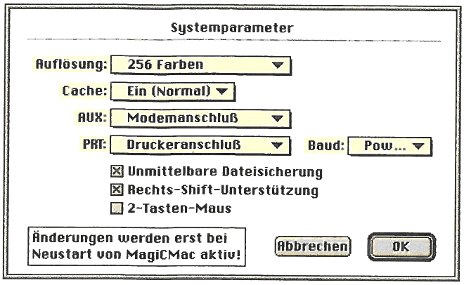 Wenn Sie sich bei der Hardware für den Aufsprung auf den Mac-Zug entscheiden, sollten Sie bei der Auswahl eines Macintoshs darauf achten, daß im Inneren ein 040er Prozessor für Tempo sorgt. Besonders attraktiv sind zur Zeit die Rechner aus der Performa-Reihe wie z.B. der Performa 475, der eine dem Centris vergleichbare Rechenleistung hat. Grundsätzlich sollte die Festplatte möglichst 280 MB oder mehr haben. Schließlich wird das eine oder andere Mac-Programm ja doch irgendwann dazukommen. Als Minimalausstattung empfiehlt sich beispielsweise ein Festplattentool wie die Utility-Sammlung „Mac Tools“ von Central Point oder die „Norton Utilities“, da sich nur mit solchen Programmen Schäden am Dateisystem reparieren lassen. Solche Schäden können bei jedem Absturz entstehen, da das MacOS oder ein gestartetes Programm wie auch MagiCMac oft Dateien offenhalten muß. Wer kaum Abstürze produziert, kann aber auch ohne ein Festplattentool arbeiten.
